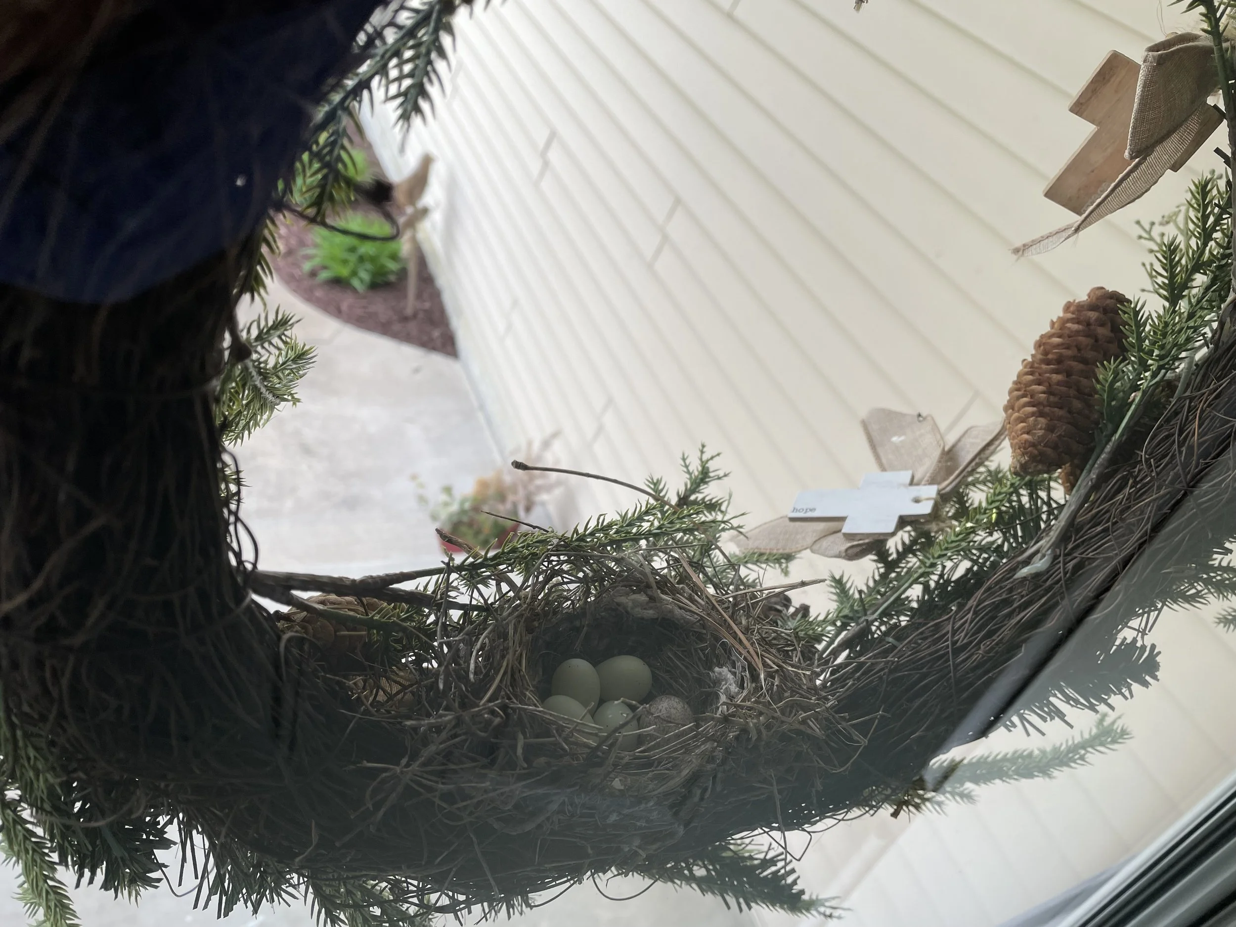 During the Spring of 2022, we were able to witness a papa bird building a nest on our wreath that was hanging outside of our door. Once the nest was built, we noticed the mama bird came to the nest to lay her eggs. It took weeks until she had laid all her eggs. One day we noticed a few of her eggs started to hatch. Then we started to see baby birds moving. After more weeks, we witnessed the mama bird feeding her babies until one day the baby birds had grown and were able to fly away from the nest. I am including a picture of the nest with the eggs, and a short video showing some of the eggs hatching with the baby birds.